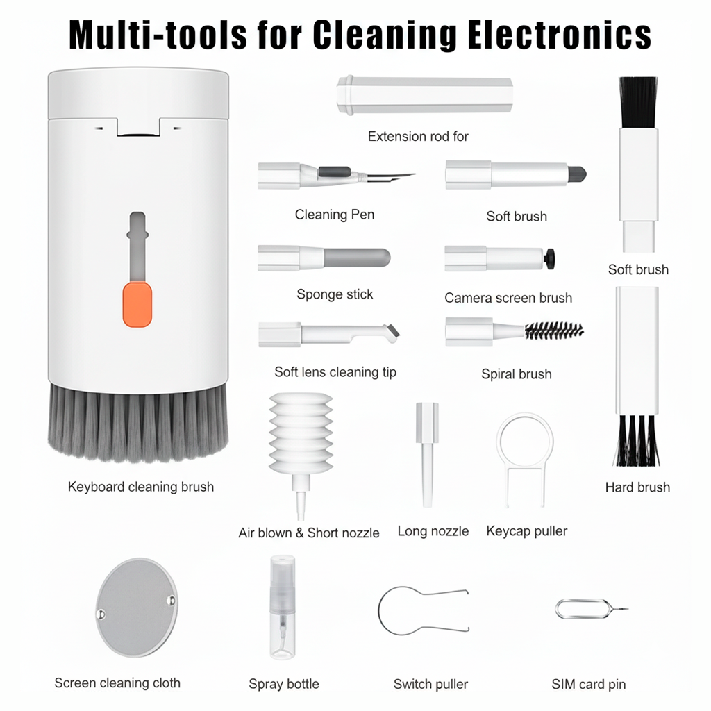 Kit de limpieza multifuncional 20 en 1, perfecto para mantener limpios tus dispositivos y espacios. Incluye herramientas para teclados, pantallas, auriculares y más. ¡Todo lo que necesitas en un solo kit!